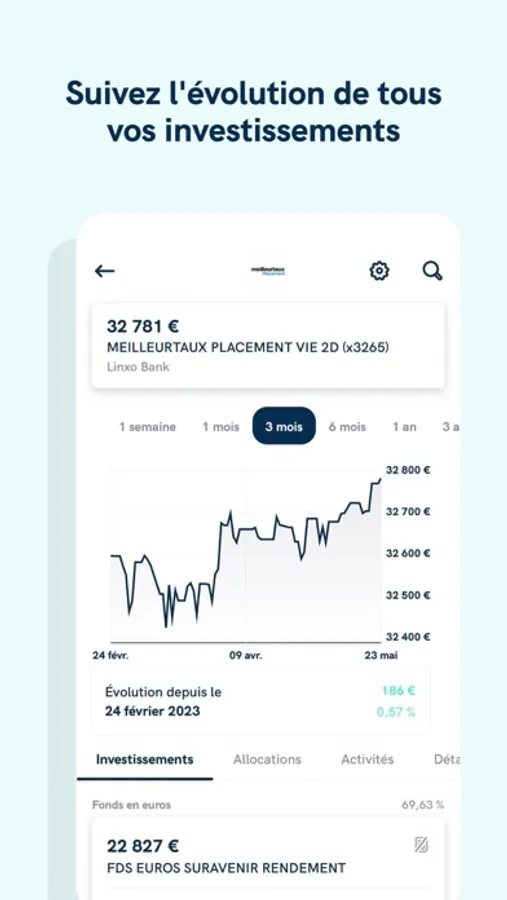 Au-delà de la vue d’ensemble sur vos comptes classiques, Linxo vous offre un suivi simplifié de tous vos comptes d’épargne (PEA, PEE, PER, Assurance vie, etc ...) quelque soit votre établissement financier. Vous pouvez également visualiser la répartition de vos fonds d’investissement ainsi que suivre leur performance dans le temps.
