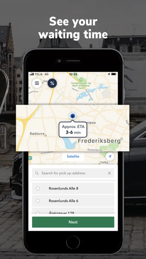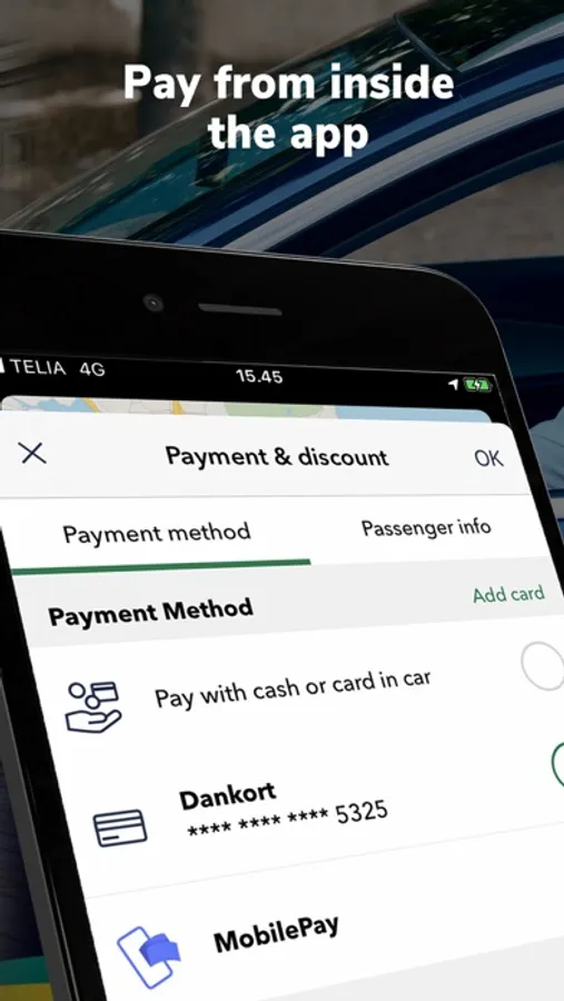 We recommend payment from inside the app using a credit card or MobilePay. This enables you to get straight on with your everyday when arriving to your destination, instead of waiting for credit card terminals inside the car. As an alternative, you may also choose to pay inside the car by Apple Pay, Google Pay or with cash.