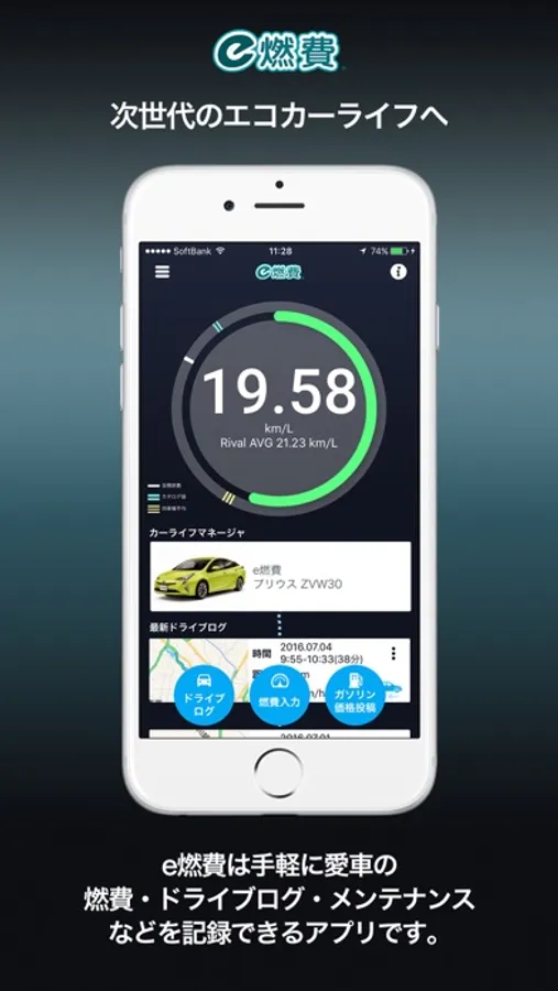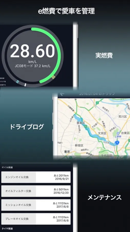『e燃費』は皆様に支持されて15年。今回新たに「ドライブログ」機能を搭載し、4世代目に進化しました。これからも皆様の豊かなカーライフを、便利で楽しい機能で応援してまいります。