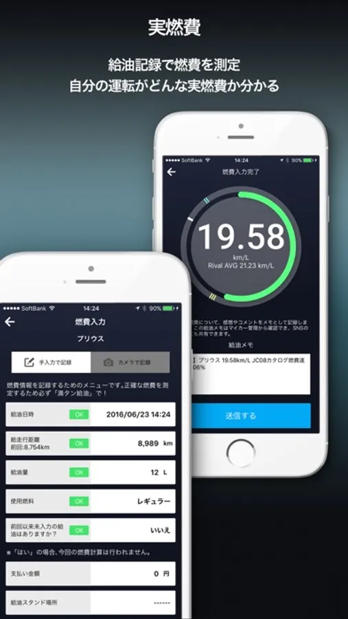 従来の手入力機能もインターフェースを一新し、スマートフォンならではのサクサク操作で燃費入力をおこなうことができます。