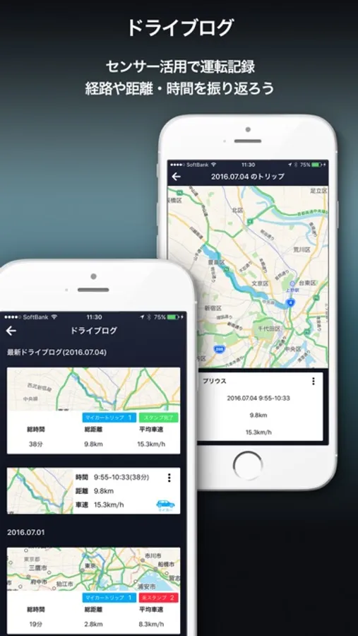 後付けパーツや車載器との接続は一切不要!スマートフォンをいつもどおり持ち歩くだけで、自動でドライブの記録を行います。更に「ドライブログ」のスタンプを入力することで愛車での移動がサマリー表示され、ドライブの思い出を振り返るだけでなく、通勤ルートの走行距離や所要時間(渋滞度合い)を知ることができ、一歩進んだ燃費改善に活用することができます。