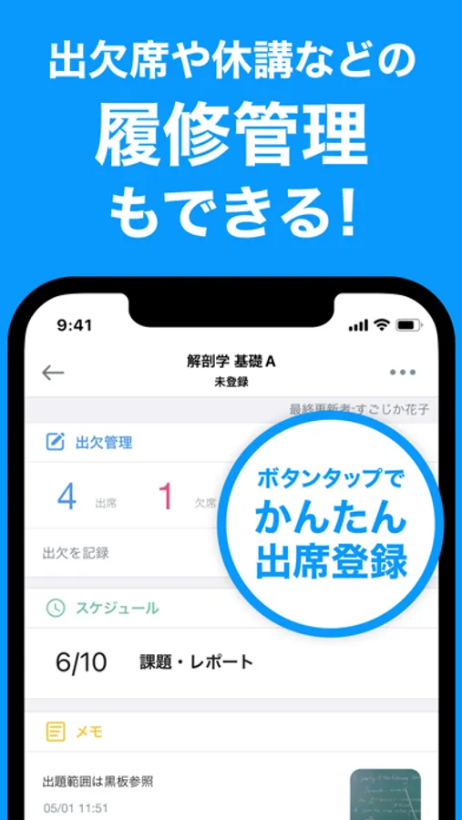 ・出欠席や休講などの履修管理もできる!