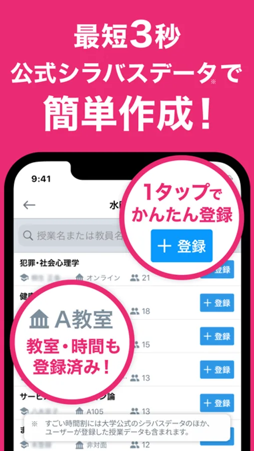 ※すごい時間割には、大学が公式に公開しているシラバスデータのほか、ユーザーが登録した授業データも含まれます。