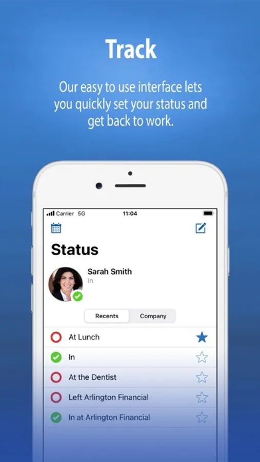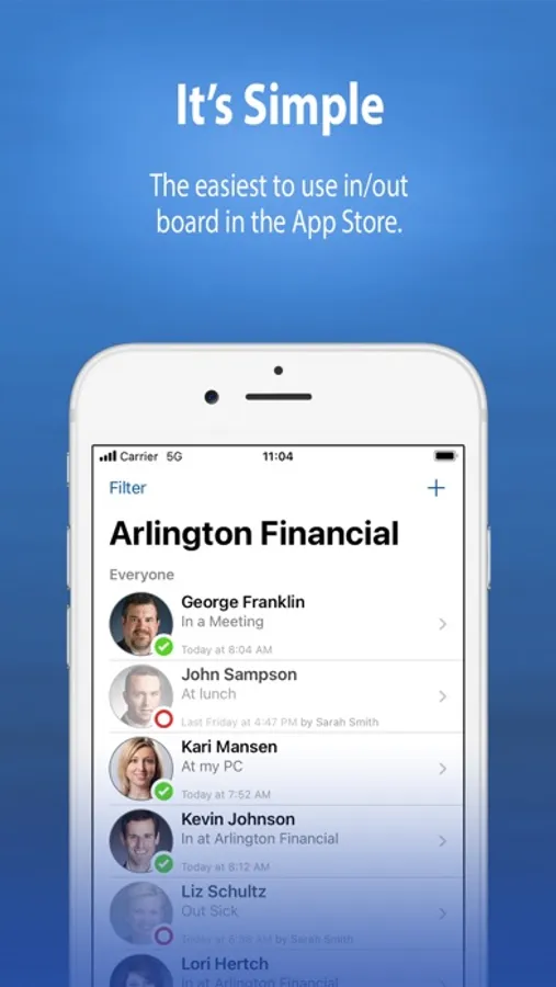 Simple In/Out is the easiest to use in/out board in the App Store. It is great for offices with people always on the go. Our easy to use interface lets you quickly set your status and get back to work. You can also configure your phone to update your status automatically based on your device's location.