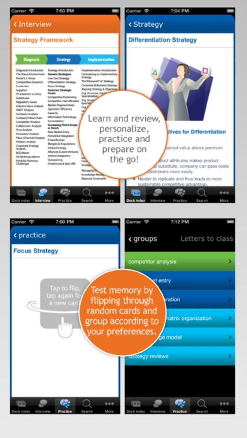 The app encourages dynamic preparation to develop creativity, structured thinking and solid business sense. There are over 80 themes that use cross-referencing to reinforce the links between diagnosis, strategy alternatives, implementation and results.