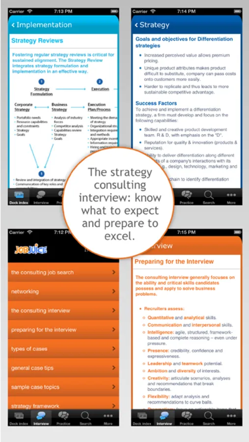 The Jobjuice Strategy & Consulting App is a complete reference guide and job interview preparation tool created for MBAs and business professionals pursuing a career in consulting or business management.
