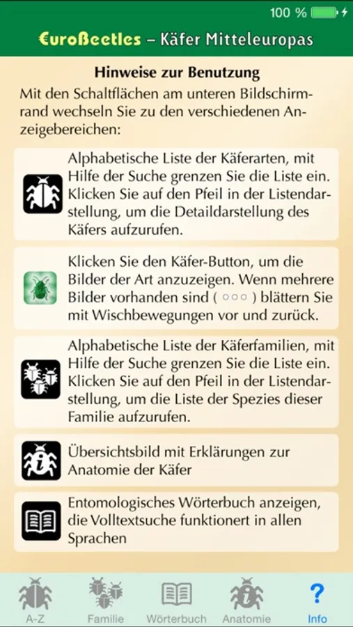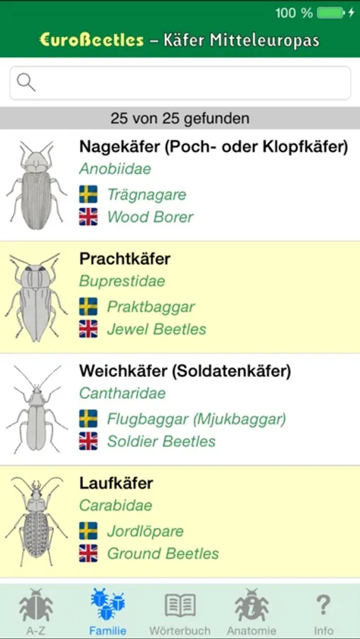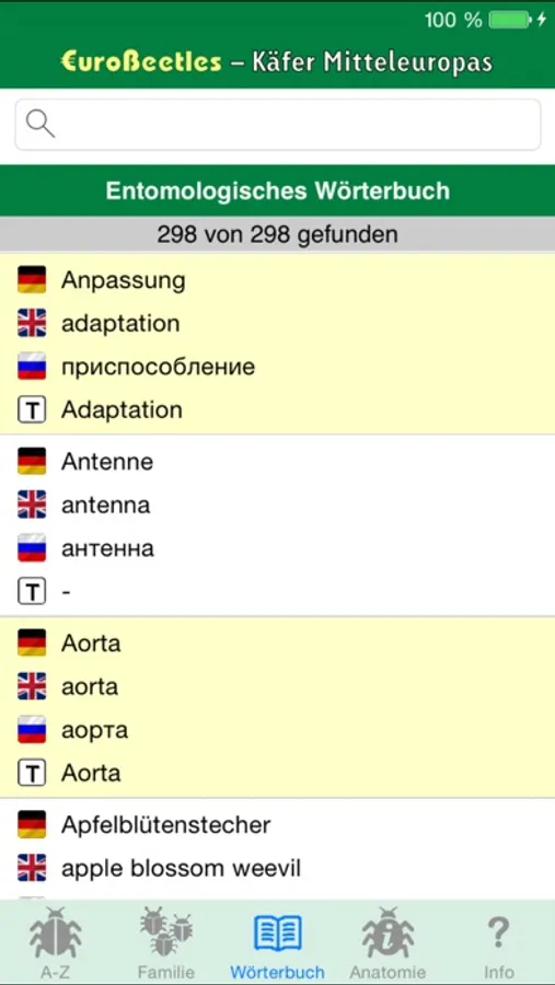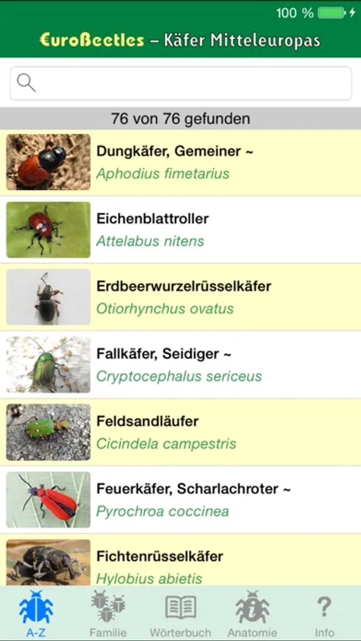 App featuring 80 most common beetles of Europe, including a short entomological dictionary in English. German, and Russian.