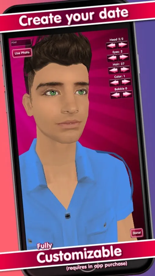 • Fully customizable - Change his face, hair, eyes, skin, clothes, and more (requires In-app purchase)
