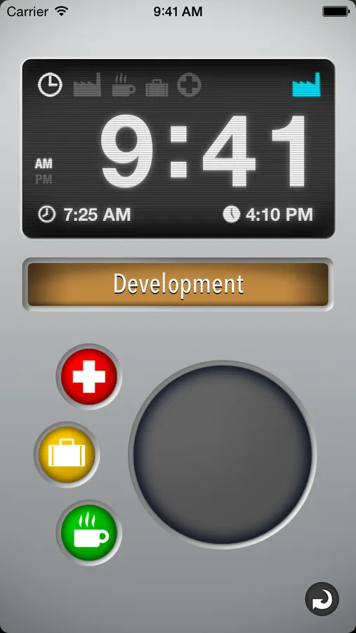 The frontend display allows you to display different states: current time, working time, break time, etc. You can change the display type with a single tap. Also, the expected end of work is displayed and updated on the fly.