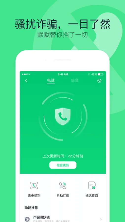 【骚扰拦截】新增垃圾信息(短信和彩信)过滤功能:会智能过滤诈骗、违法、广告等垃圾信息,还支持关键字过滤。陌生来电时实时提醒、拦截骚扰或诈骗电话,从此再也不怕广告中介骚扰和各种欺骗钱财的诈骗电话。每日更新骚扰号码库,及时精准拦截最新骚扰电话,更能轻松查询归属地。提供实时号码包下载,提升骚扰电话识别率。