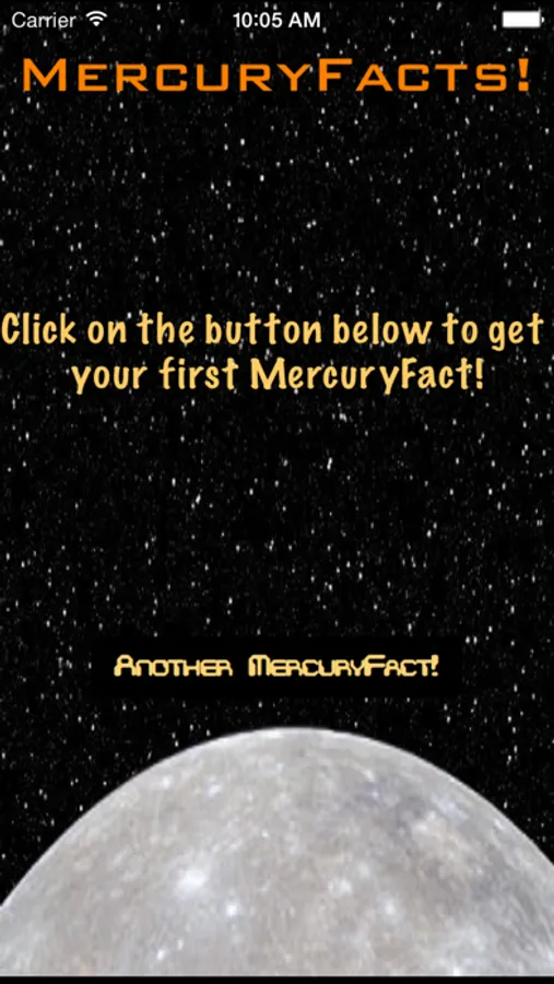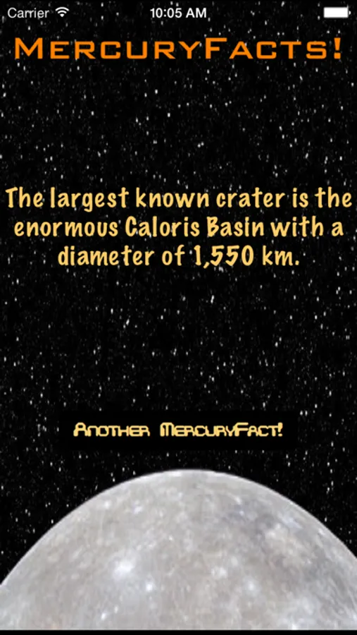 Simply click on the 'Another MercuryFact!!' button to receive a random fascinating fact about the famous innermost planet, Mercury, from the world of Astronomy and Space Physics.