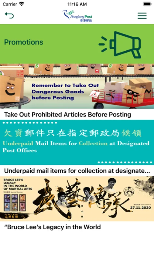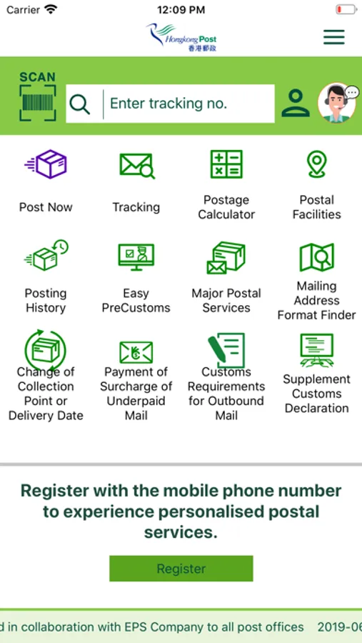 Register on the App with the item number and passcode sent in SMS by Hongkong Post to change the collection point to iPostal Stations or post office (applicable to inward EMS/Parcel with the electronic data including recipient’s mobile number already provided to the original postal administration and local parcel/EC-Get mail items with recipient’s mobile number provided), or change the delivery date (applicable to the above-mentioned inward EMS and inward/local parcel).