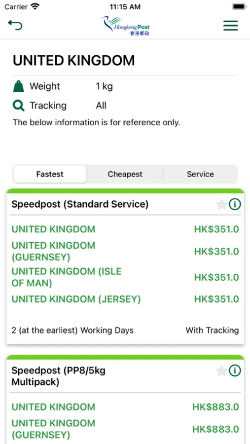 Calculate postages and show related information for the posting of mail items according to destinations and different service requirements, and offer comparisons on different options in order of postages, delivery time or your personal preference, enabling you to go for the option that suits you best.