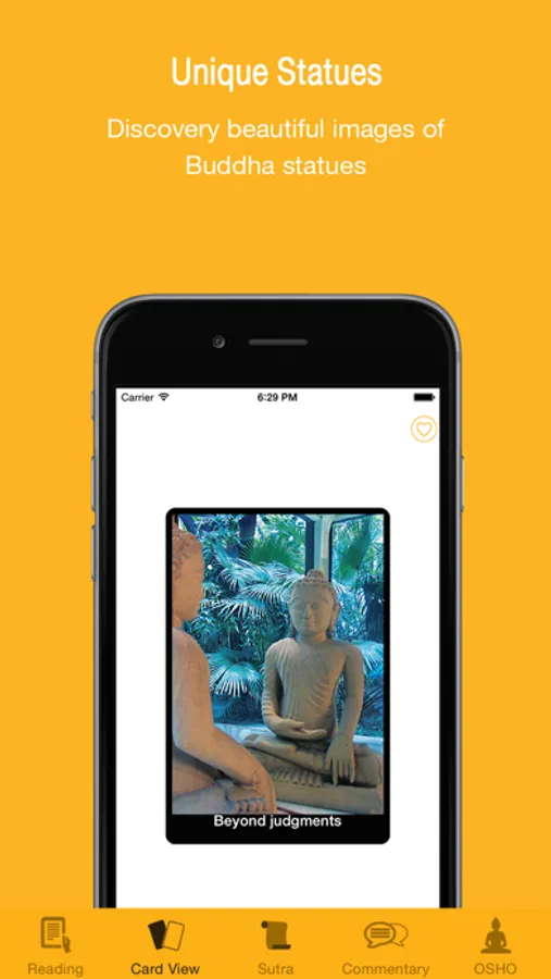 Each card contains a sutra, a commentary by Osho, and a beautiful image of a Buddha statue.