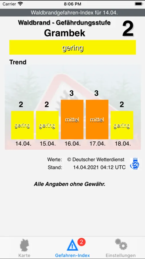 Nicht nur für Feuerwehrmänner interessant. Mit dieser App können Sie in der Waldbrandsaison (in den Monaten von ca. März bis Oktober) den aktuellen Waldbrandgefahren-Index sowie den Trend für Ihre ausgewählte Region abrufen.