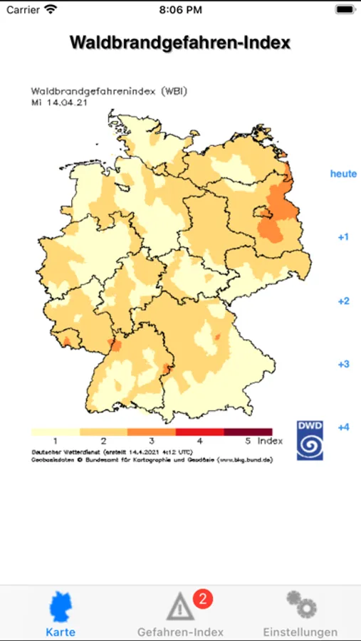 + Anzeige der Waldbrandgefahren Karte für Deutschland für heute sowie die nächsten 4 Tage