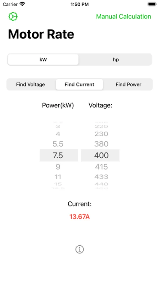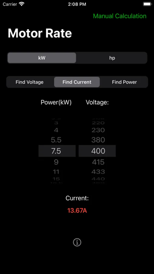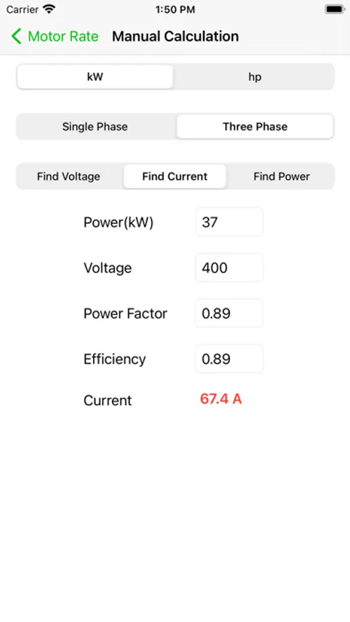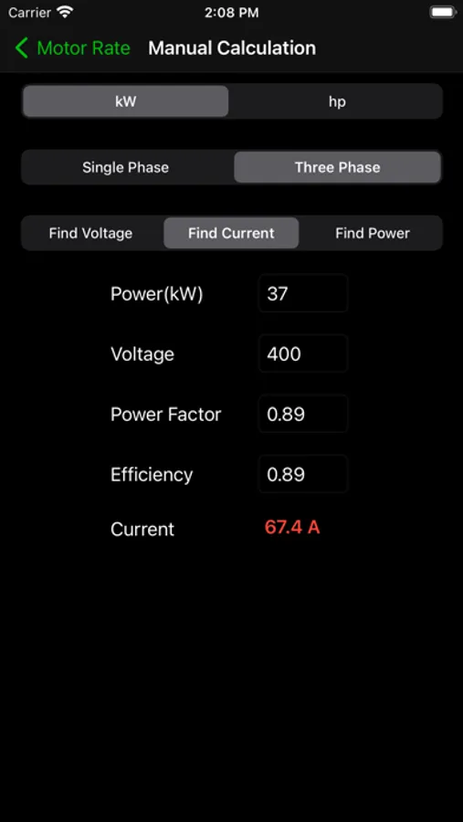 The second screen gives you the opportunity to work out power, current and voltage using the power factor and efficiency manually.