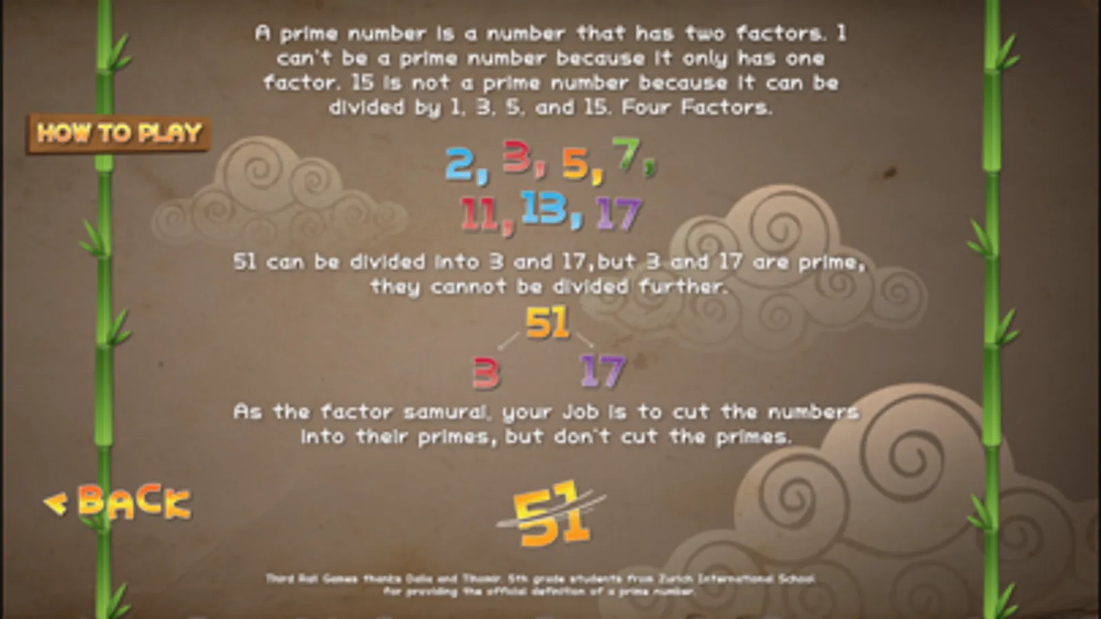 Factor Samurai will reinforce the arithmetic principles of multiplication and division by continually challenging the player to remember which numbers can be factored into smaller values, and which ones can't.