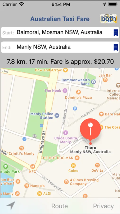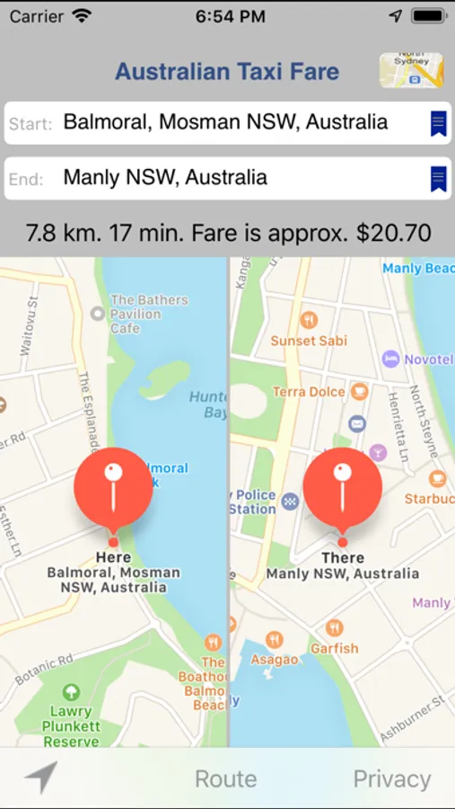 This app calculates the approximate Taxi Fare between two locations in metropolitan areas of all States and Territories in Australia, including Hobart, Sydney, Melbourne, Canberra, Geelong, Alice Springs, Brisbane, Darwin, Launceston, Perth, Fremantle and Adelaide. It displays a map for each address entered, showing the location of the address to ensure the correct address has been identified.