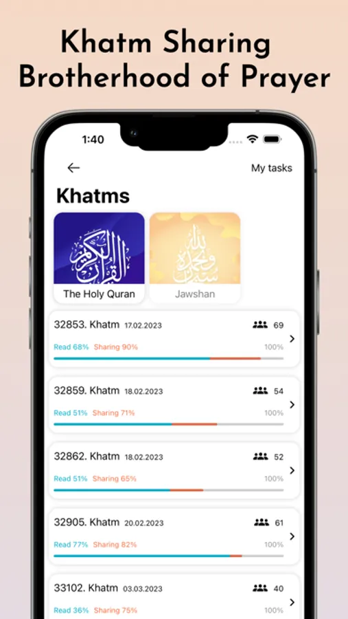 • With Khatam Online, you can join one of the many Muslims to participate by choosing Ayat, Surah, Halaman, and Juz. You can easily read the tasks you have selected in the app.