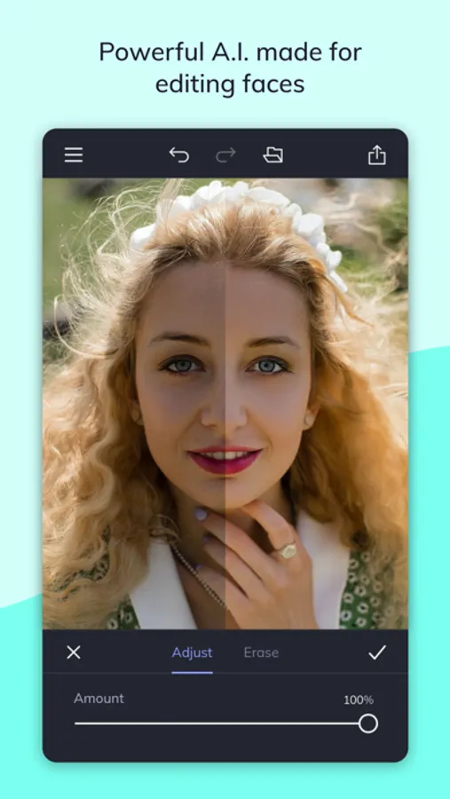 Our A.I. Portrait Enhancer gives you professional portrait retouching results, all in a single tap. Quickly enhance exposure, soften the appearance of fine lines and blemishes on all skin tones, whiten teeth and brighten eyes without eliminating freckles and beauty marks!