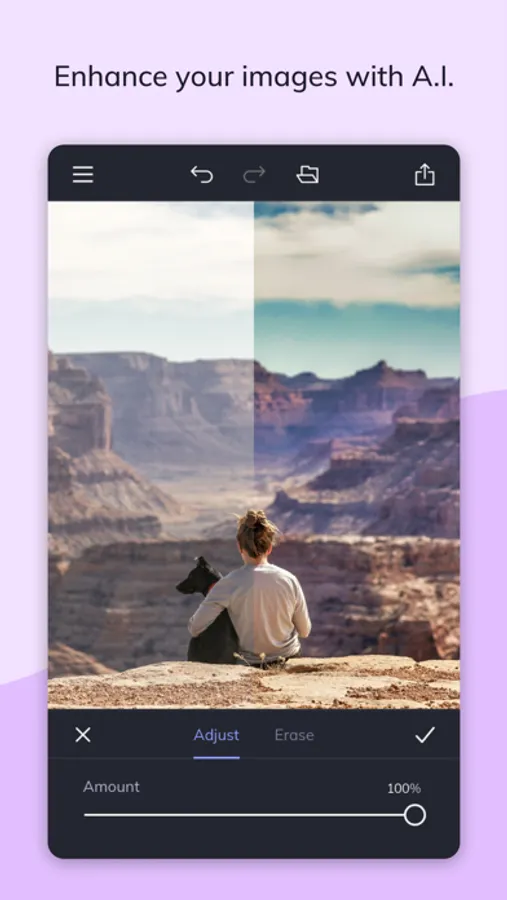 There's a lot of trial and error and fine-tuning involved in enhancing a photo. Our A.I. Image Enhancer takes the guesswork out of photo editing. With a single tap, it'll make colors more vibrant and add a touch of contrast to enhance details, giving your photos what they need to really pop.