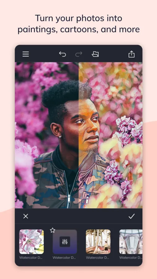 Our Artsy effects are the most unique feature of our Photo Editor. With one tap, your photos will take on stunning, artistic characteristics. From realistic textures to natural-looking brush strokes and saturated color palettes, our artsy effects will instantly turn your photo into a work of art!