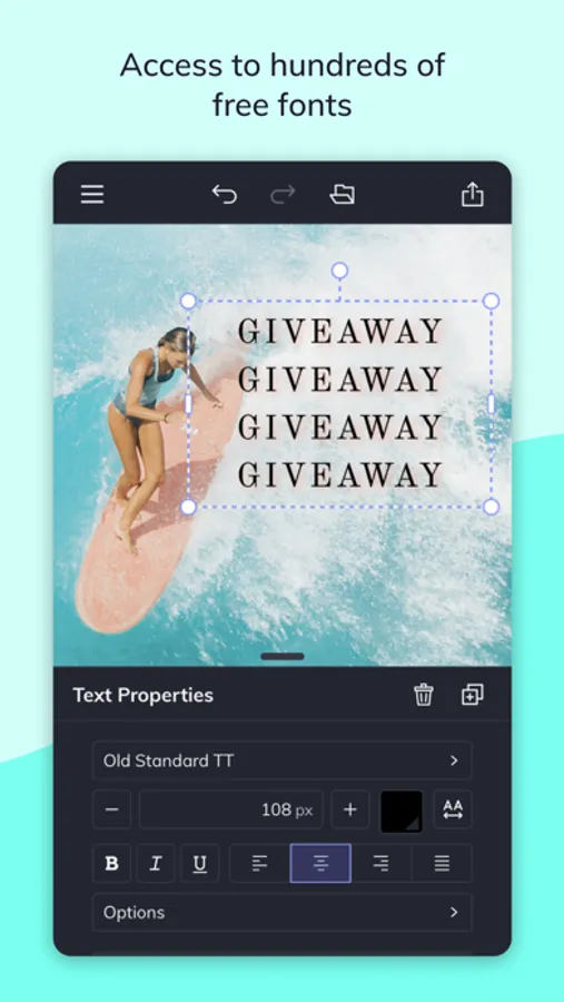 Our Text Editor is packed full of fonts and customization options to add text to photos, designs, and collages. Choose from our collection of fonts hand-selected by our team of graphic designers, upload your own fonts, or use Google Fonts!