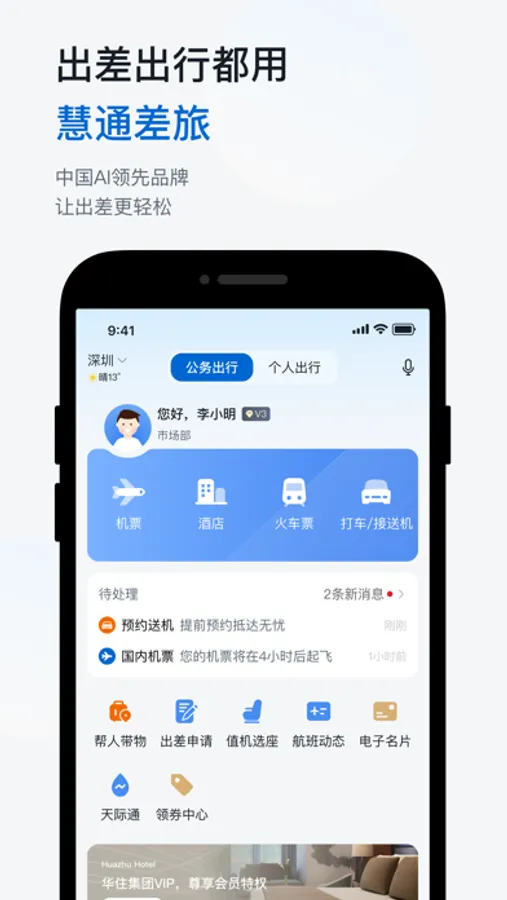 慧通差旅是一款专为企业打造的商旅移动客户端,涵盖企业公务出行的差旅管理、机票、酒店、火车票、打车预订功能,是企业员工出差的差旅管家;同时支持企业员工的个人出行,旅游度假自由行,随时随地订票!