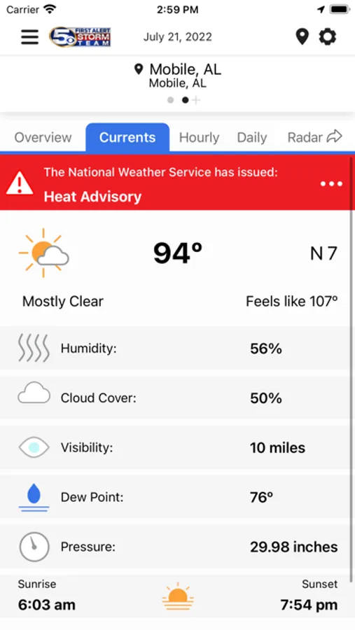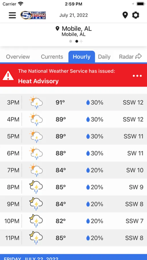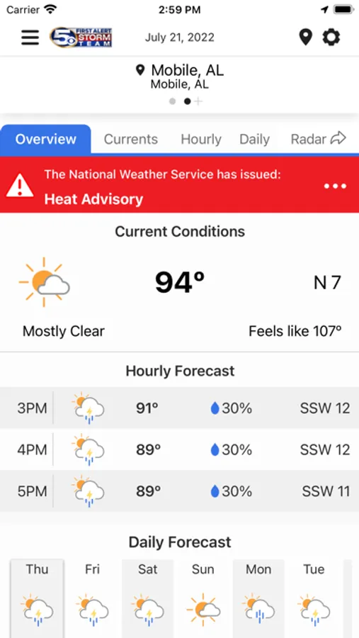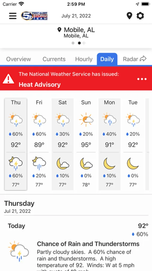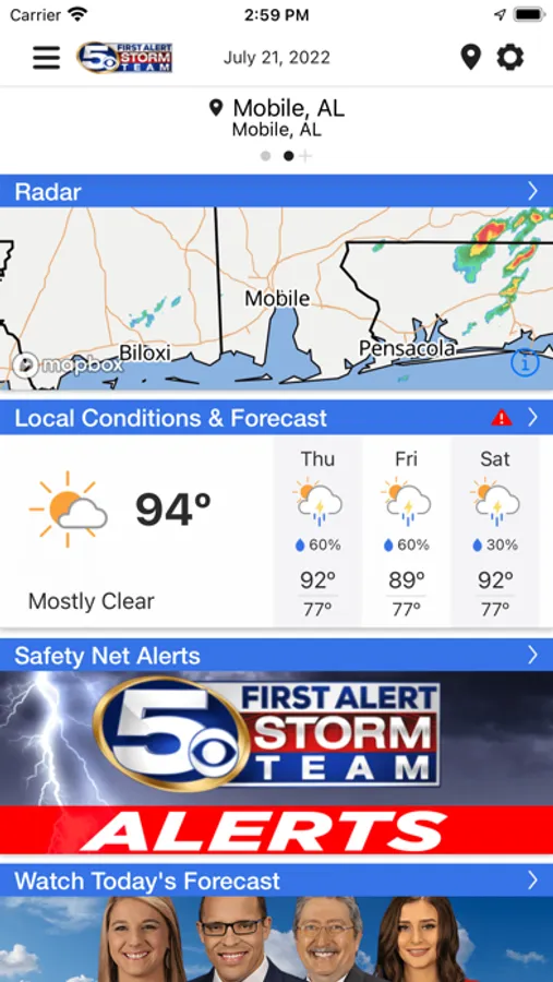 Never let the weather catch you by surprise again. The trusted weather experts at First Alert Weather deliver Mobile, Pensacola, and the Gulf Coast's most accurate hour-by-hour forecast for the next day and for the week ahead. Unlike other weather apps, you'll get a local forecast that is customized for you. Download the WKRG Weather app for fast, accurate local and national weather at your fingertips. With its personal alert notifications, you'll know when significant weather is heading your way and when to take cover. And when you are traveling, use WKRG Weather to get real-time weather forecasts, interactive radar and current conditions for anywhere in the U.S.