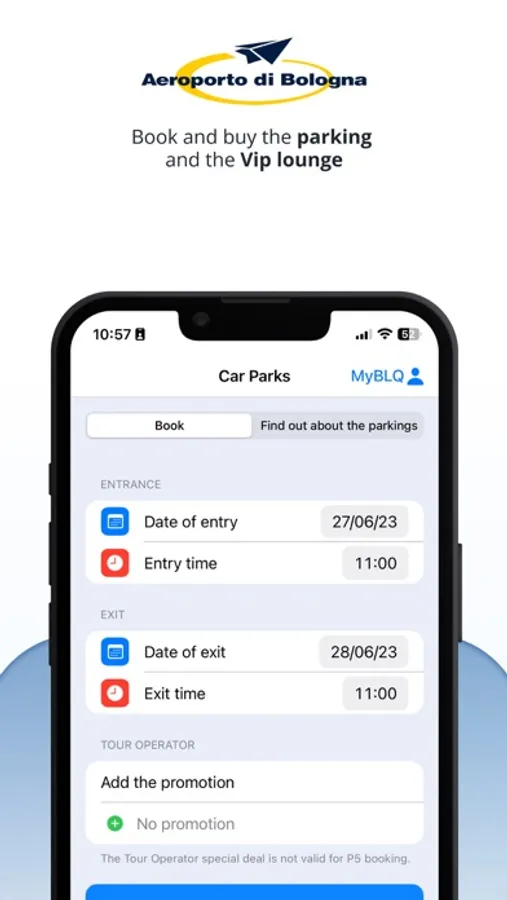 You will be able to book and buy the parking at the airport's car park and access your booking directly from your reserved MyBLQ area present on the app.