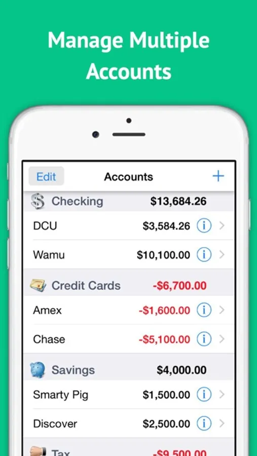 Create Multiple Accounts (Checking,Savings,Debit,Cash etc.) with Custom Grouping.