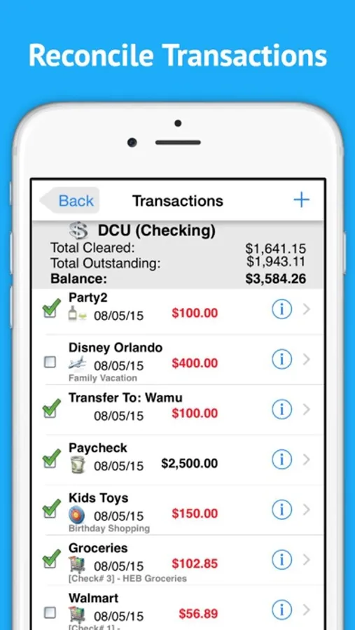 Reconcile your Transactions by Tapping on the Check Box in transaction register.