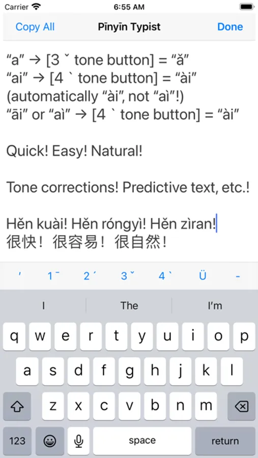 **Pīnyīn Typist lets you quickly and easily type Pīnyīn with tone marks while using Apple’s system keyboards, and it lets you benefit from their features, like predictive text, text replacement, etc., as well as future enhancements. Pīnyīn Typist similarly works with third-party keyboards like Fleksy, etc.**
