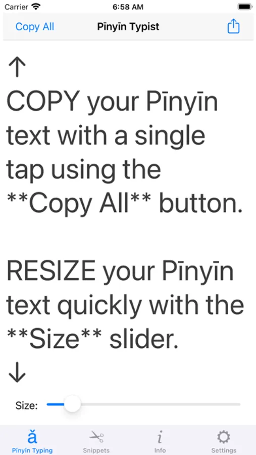 • The size of the text in the Pīnyīn Typing tab view can be quickly and easily adjusted with a slider—all the better for seeing those little Pīnyīn tone marks.