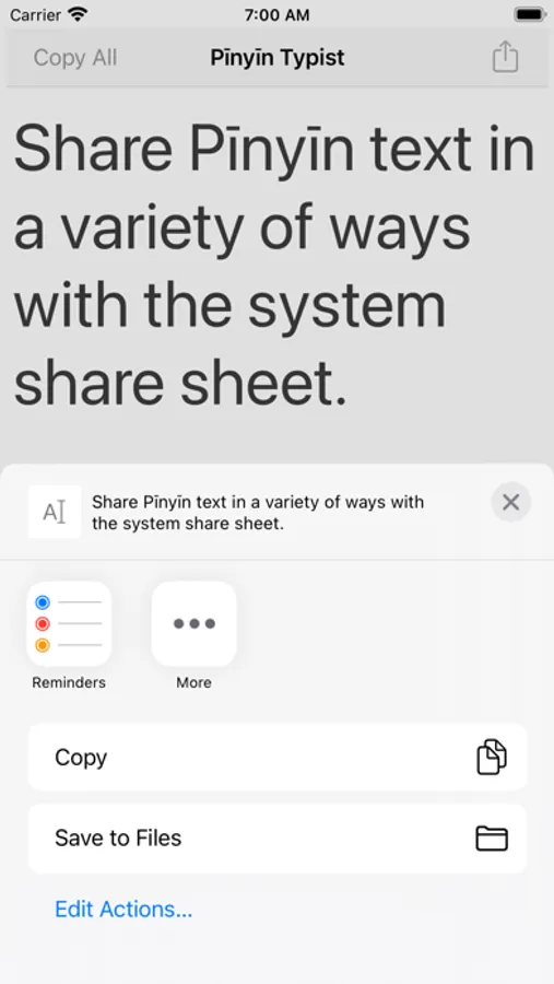 Pīnyīn Typist’s sharing functionality lets you share Pīnyīn, etc. text in the various ways enabled by iOS, including email, Messages, AirDrop, Twitter, etc.
