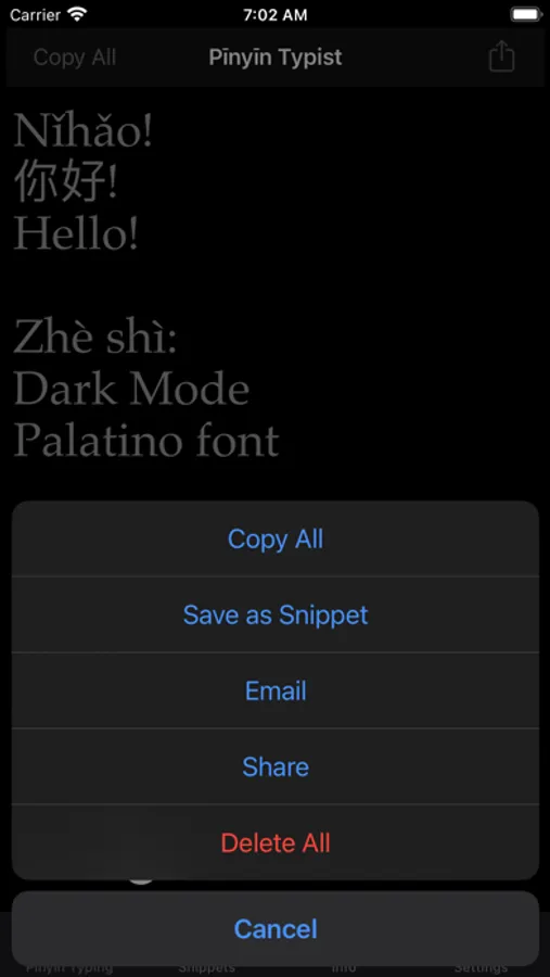 • The text in the Pīnyīn Typing tab view (and its size) can be saved as a snippet for future use, with a title that you can choose. A snippet can be shared in the various ways enabled by iOS.