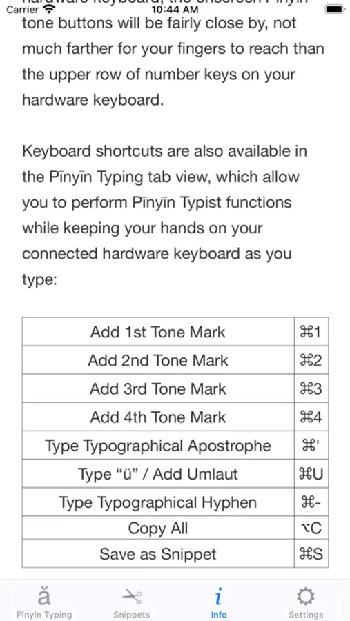 Pīnyīn Typist works well with hardware keyboards. Hardware keyboard shortcuts are now available.