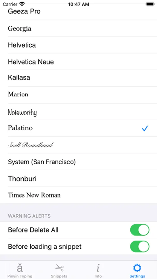 • Different fonts can be selected for the text in the Pīnyīn Typing tab view.