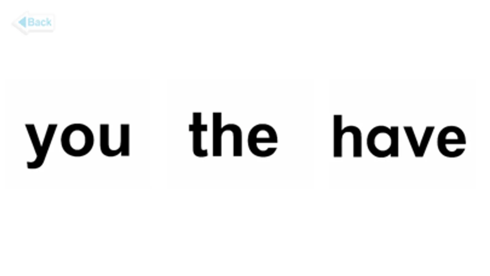 Three sight words appear on screen. The narrator calls out the name of a sight word, and when your child taps the correct sight word it transforms into the character from the award-winning Meet the Sight Words 1 DVD. Large sight word characters make it easy for little fingers to tap, and fun celebratory music in each scene encourages them to play over and over again!