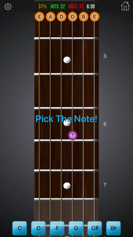You are presented with a random note on the fretboard, and are offered a variety of choices for the correct answer. Just pick the button corresponding to the correct choice to score a hit!