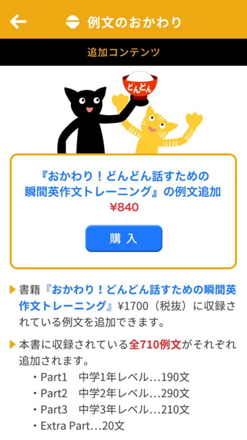 本アプリを購入後、¥860で購入することができます。書籍版(¥1,785)のすべての例文と収録例文全体のシャッフル機能が追加されます。