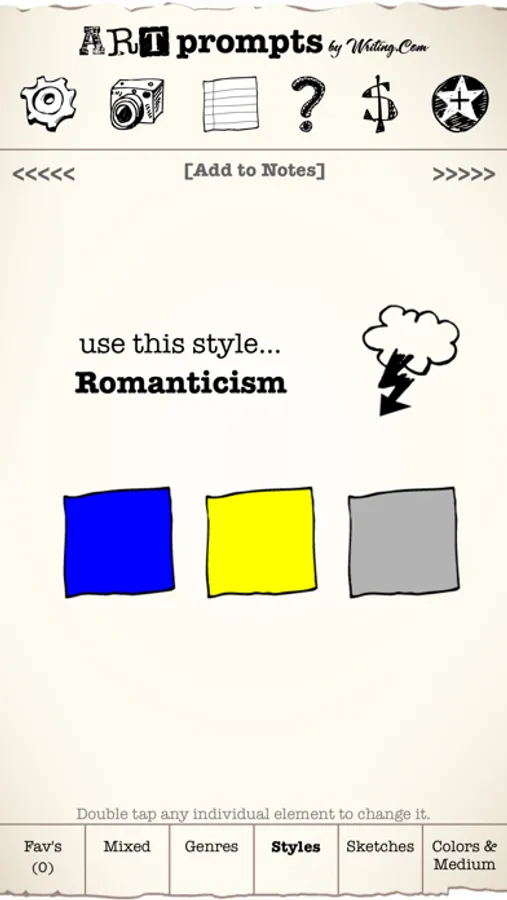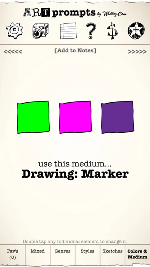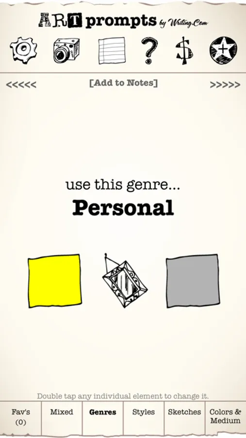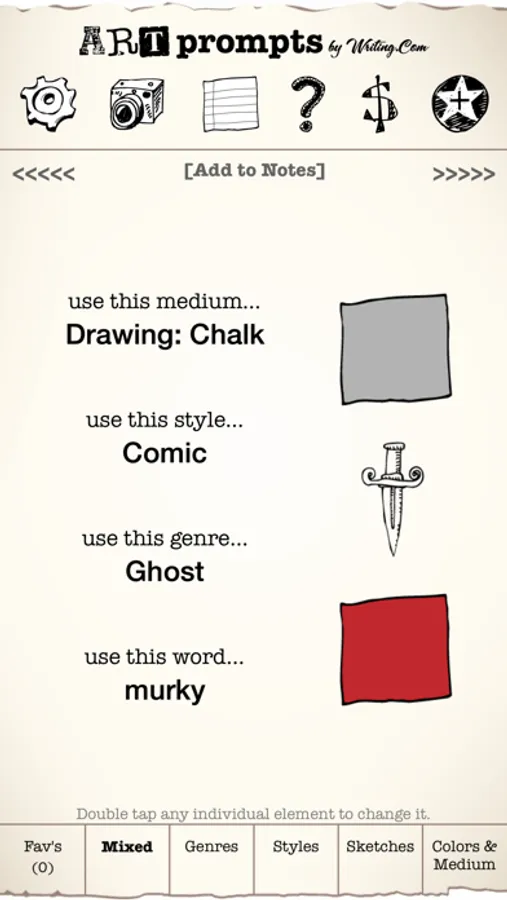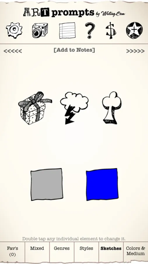** Includes over 400 words, 60+ genres, 15+ mediums, 24 artistic styles, 60 sketches and 10 colors -- all of which generate millions of unique prompts. Add up to 4 additional packs of prompts through in-app purchase. Each pack includes more words, sketches and colors. The more elements you have, the more varied your prompts will be! With all 4 add-on packs, this app can generate billions of unique prompts!
