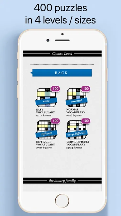 • 400 puzzles, 4 difficulty levels and grid sizes