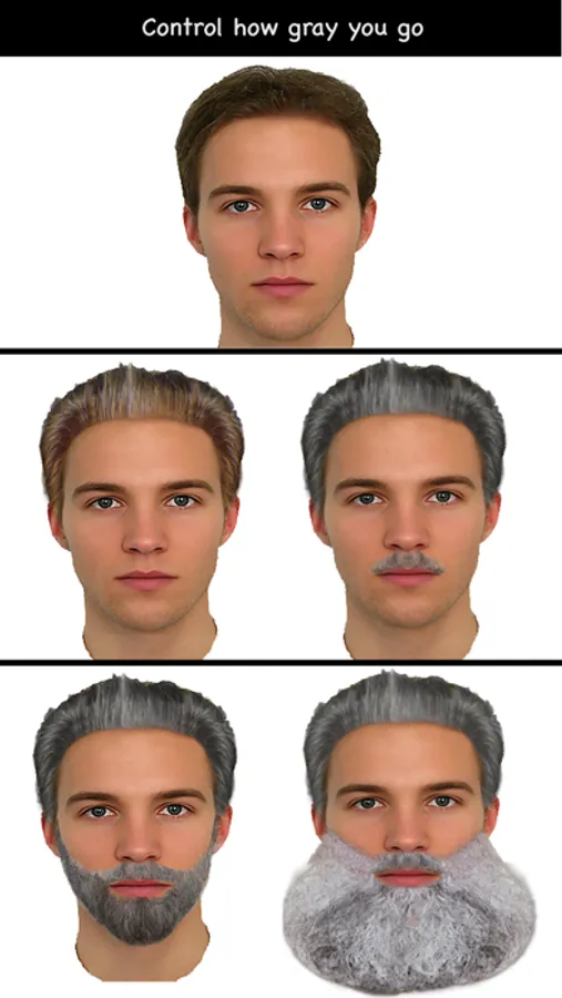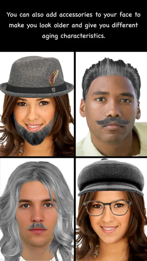Simply take a photo of your face with the camera or choose an image from your photos library. Once you have a picture of your face there are several different face masks that have different wrinkles that you can choose from. Each of these masks are highly customizable so you can morph them to your face and choose how many wrinkles you want. By adjusting the editor you can define how deep the wrinkles are as well. You can also give yourself a beard or mustache and adjust how gray it is, along with how gray your hair goes. Edit your face however you want!