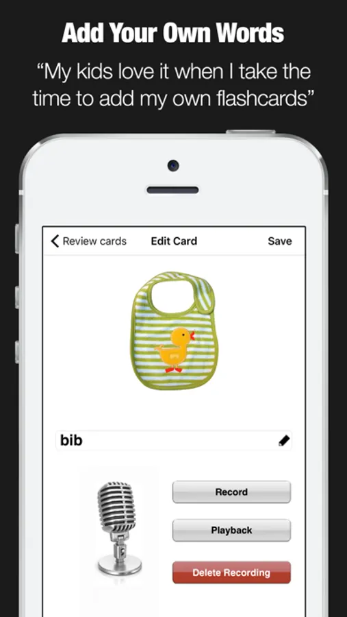 "I love this app. You can customize all the flashcards with your own voice plus add your own. My baby loves it and his older siblings had so much fun recording their voices to the animal flashcards along with silly animal sounds. It is probably one if the most fun baby apps available."
