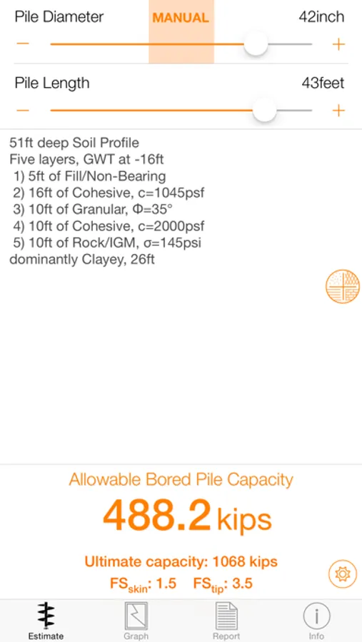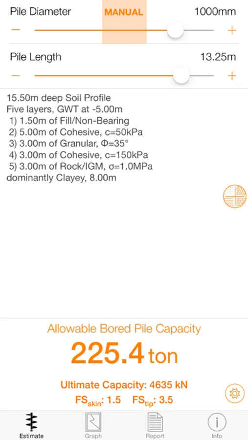 Uses advanced soil parameters for more precise estimation such SPT, cohesion increment with depth, diameter reduction in rock as well as partial safety factors for skin friction and tip resistance.