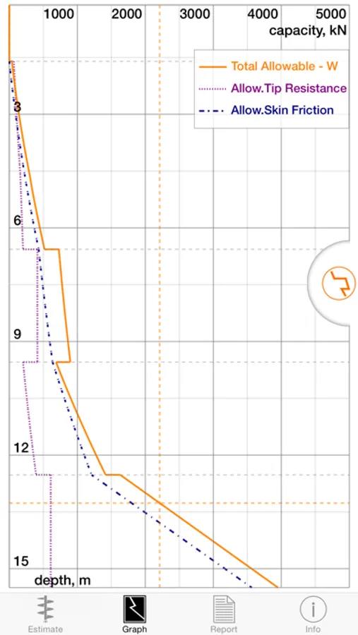 Graphs depth vs. friction, tip and allowable bearing capacities with optional correction of tip resistance with respect to underlying strata.