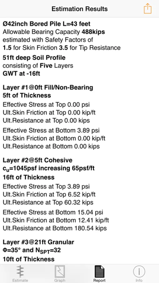 Prepares detailed report for bearing values of each layer with average effective stress, skin friction and tip resistance at top and bottom of layer.