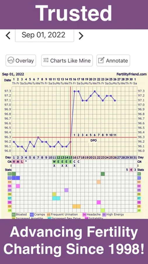 Track your period and other fertility signs (basal body temperature/BBT, cervical fluid, symptoms, etc). Fertility Friend will alert you to your ovulation date and the best days to conceive and offer personal, timely insights.